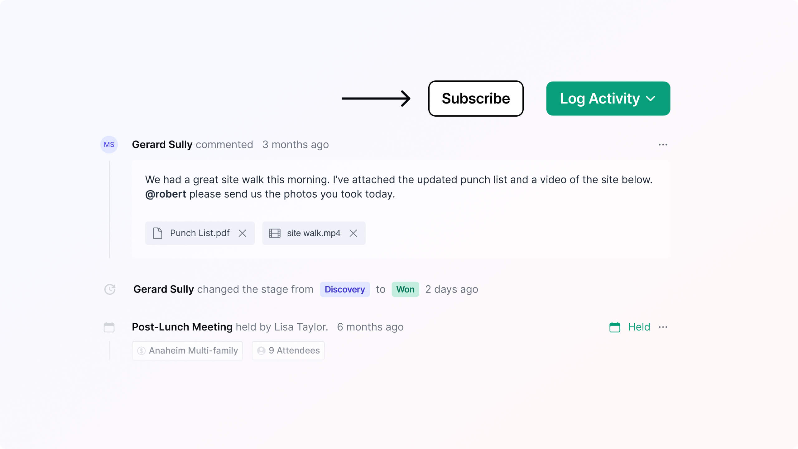 The ability to Subscribe to Activities on relevant opportunities, companies, and contacts in Buildr means your entire team stays up-to-date without the hassle of data upkeep or follow-up. New developments, priorities, meetings and tasks won't fall through the cracks; historical activity data stays tidy.